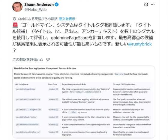 どうやら、この「Goldmine」システムが、Googleが検索結果に表示するタイトルを<title>タグから書き換える際の内部的な評価ロジックの一部である可能性が示唆された、という内容です。